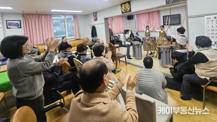 케이부동산뉴스 김교민 기자 | 지난 24일, 수원특례시 영통구 매탄1동은 매탄1동지역사회보장협의체와 함께 현대힐스테이트경로당 자매결연 행사로 The꿈 지역아동센터 아동들이 준비한 난타공연을 선보였다.