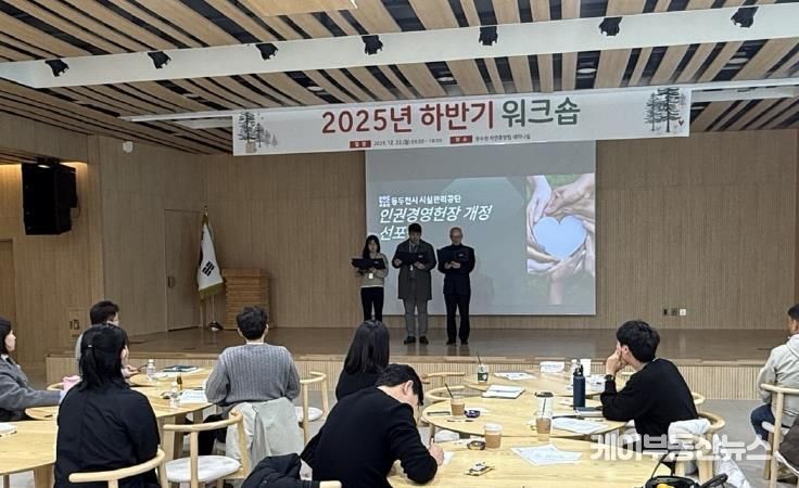 케이부동산뉴스 김교민 기자 | 동두천시 시설관리공단은 지난 22일 동두천 자연휴양림 세미나실에서 열린 2025년 하반기 워크숍에서 인권경영 헌장 개정 및 선포식을 개최했다고 밝혔다.