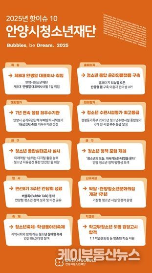 케이부동산뉴스 김교민 기자 | 안양시청소년재단은 올 한 해를 돌아보는 ‘2025년 안양시 청소년재단 핫이슈 10’을 선정하고, 2025년 청소년 정책 컨트롤타워로서의 기능을 강화해 청소년 체감형 정책 성과를 거뒀다고 30일 밝혔다.
