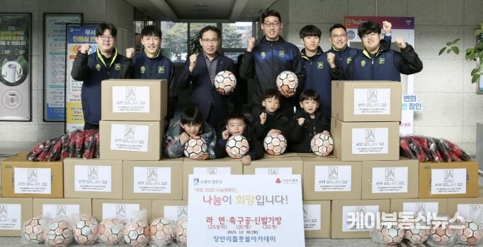 케이부동산뉴스 김교민 기자 | 수원시 장안구는 장안리틀풋볼아카데미가 지난 30일 장안구청에 라면 25상자와 축구공 20개 기부했다고 밝혔다. 이번 기부는 아카데미 회원들이 십시일반으로 정성을 모아 마련한 것으로, 장안구 관내 어려운 이웃들에게 전달될 예정이다.