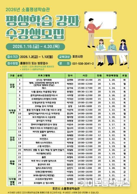 케이부동산뉴스 김교민 기자 | 포천시는 오는 12일까지 소흘평생학습관에서 운영하는 2026년 1기 정규 평생학습 프로그램 수강생을 모집한다.