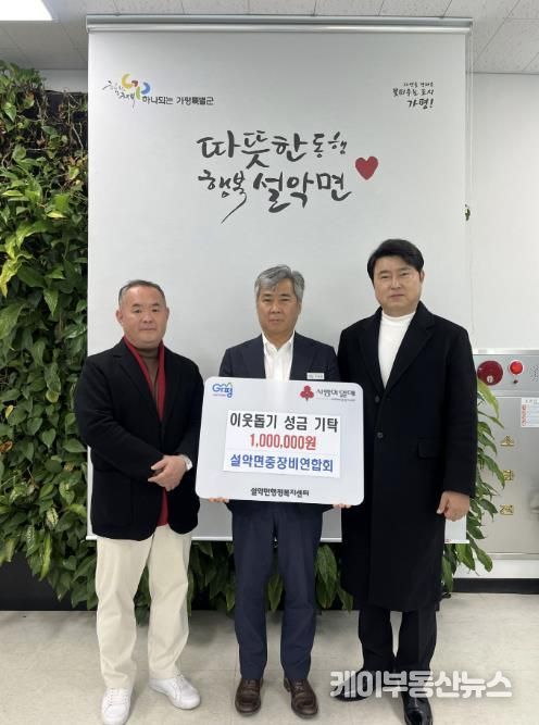 케이부동산뉴스 김교민 기자 | 가평군 설악면중장비연합회 권혁 회장과 안태영 총무는 6일 설악면 행정복지센터를 방문해 이웃돕기 성금을 전달했다. 이번 기탁은 14년째 이어온 연합회의 정기적인 나눔 활동의 일환이다.