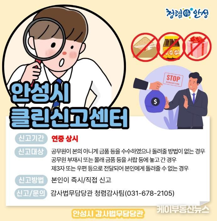 케이부동산뉴스 김교민 기자 | 안성시는 시민들에게 신뢰받는 공정하고 투명한 행정 서비스를 제공하기 위해 ‘클린신고센터’를 연중 상시운영하며 청렴한 행정문화 정착에 힘쓰고 있다고 밝혔다.