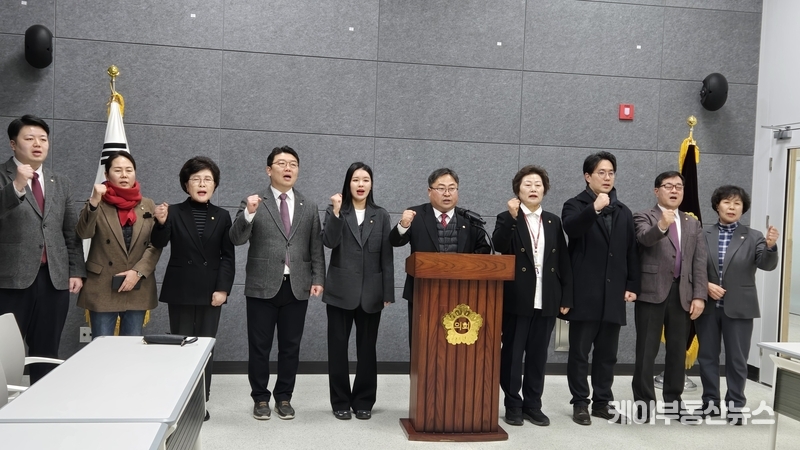 케이부동산뉴스 김교민 기자 | 수원특례시의회 국민의힘(대표의원 박현수) 의원들이 8일 수원특례시의회 1층 브리핑룸에서 기자회견을 열고, 이재명 정부를 향해 “경기 남부 반도체 생태계를 파괴하는 무책임한 정치적 기만행위를 즉각 중단하라”고 강하게 촉구했다.