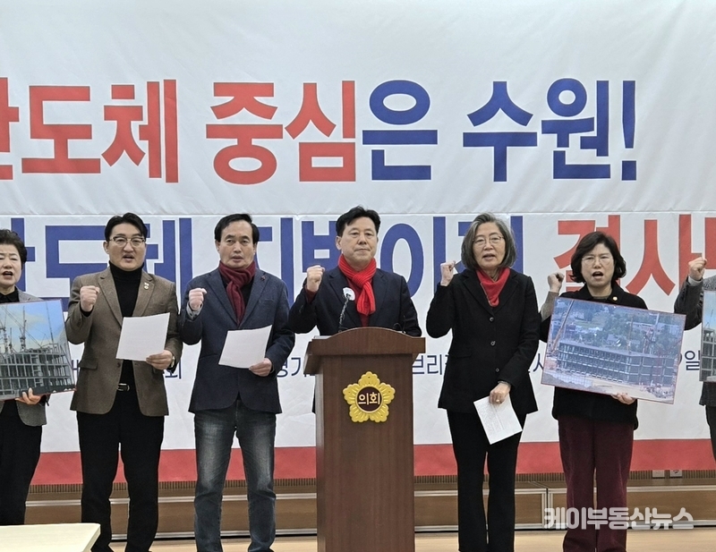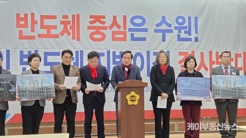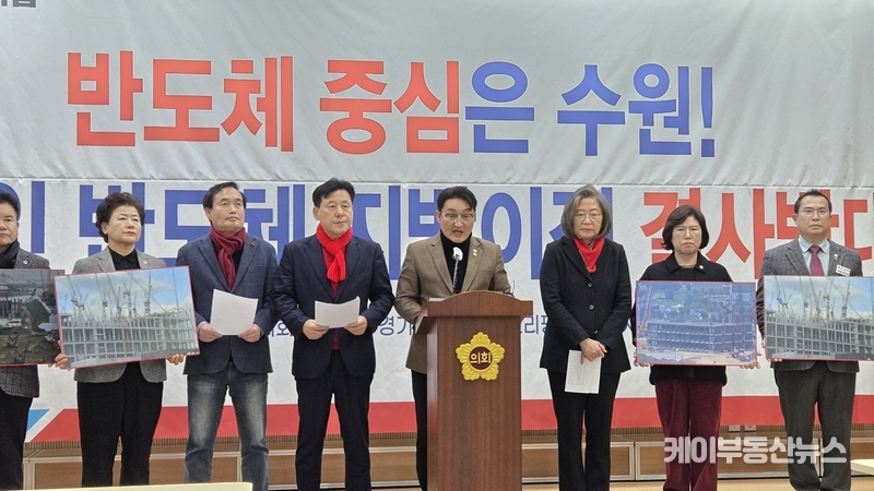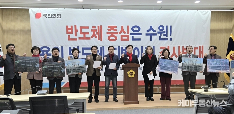 케이부동산뉴스 김교민 기자 | 국민의힘 수원특례시 당원협의회 위원장들이 9일 오후2시 경기도의회 3층 브리핑룸에서 기자회견을 열고, 최근 정치권 일각에서 제기된 ‘용인 반도체 클러스터 지방 이전론’에 대해 “대한민국 산업 경쟁력을 스스로 훼손하는 무책임한 주장”이라며 강하게 반대 입장을 밝혔다.