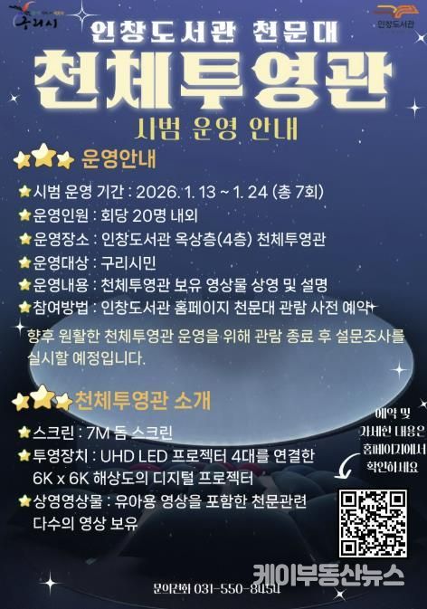 케이부동산뉴스 김교민 기자 | 구리시는 오는 1월 13일부터 24일까지 인창도서관 옥상에 설치된 천체투영관의 시범운영을 실시한다고 밝혔다.