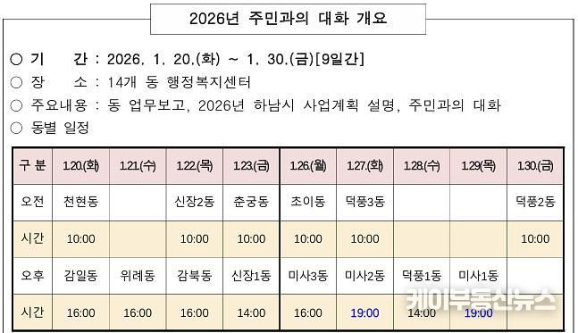 케이부동산뉴스 김교민 기자 | 하남시는 오는 1월 20일부터 30일까지 관내 각 동 행정복지센터를 순회하며 ‘2026년 주민과의 대화’를 개최한다고 밝혔다.