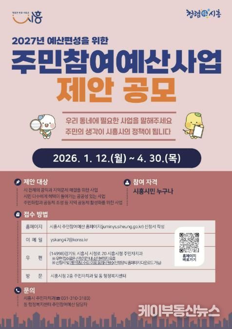 케이부동산뉴스 김교민 기자 | 시흥시는 오는 4월 30일까지 주민들이 직접 사업을 제안하는 ‘시흥시 주민참여예산 제안’을 신청받는다.