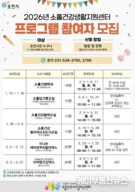 케이부동산뉴스 김교민 기자 | 포천시 소흘건강생활지원센터는 시민들의 건강 증진과 활기찬 일상 지원을 위해 오는 19일부터 ‘2026년 상반기 건강증진 프로그램’ 참여자를 모집한다.