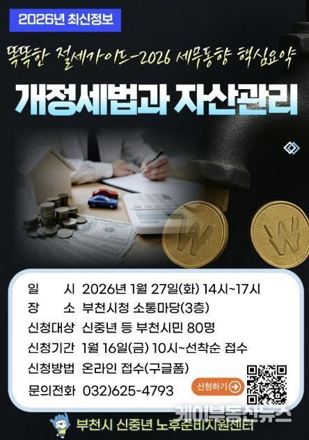 케이부동산뉴스 김교민 기자 | 부천시는 1월 27일 시청 3층 소통마당에서 ‘2026년 개정세법과 자산관리’ 재무특강을 진행한다. 이번 특강은 오후 2시부터 5시까지 부천시민 80명을 대상으로 무료로 진행되며, 신중년의 자산관리 역량을 높이고 안정적인 노후설계를 지원하기 위해 마련됐다.