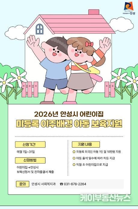 케이부동산뉴스 김교민 기자 | 안성시는 2026년부터 어린이집에 다니는 미등록 외국인(이주배경) 영유아에게 월 10만원의 보육지원금을 지원한다고 밝혔다.