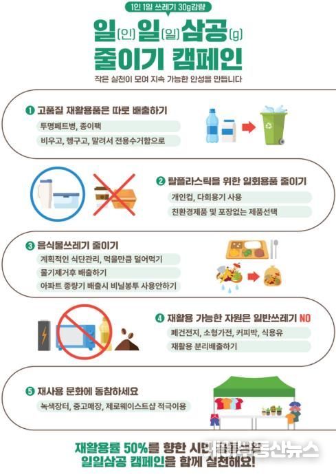 케이부동산뉴스 김교민 기자 | 안성시는 시민의 자발적인 실천을 통해 재활용률을 높이고 생활쓰레기 발생량을 줄이기 위한 ‘1인 1일 쓰레기 30그램 줄이기(일일삼공) 캠페인’을 적극 추진하고 있다고 밝혔다.