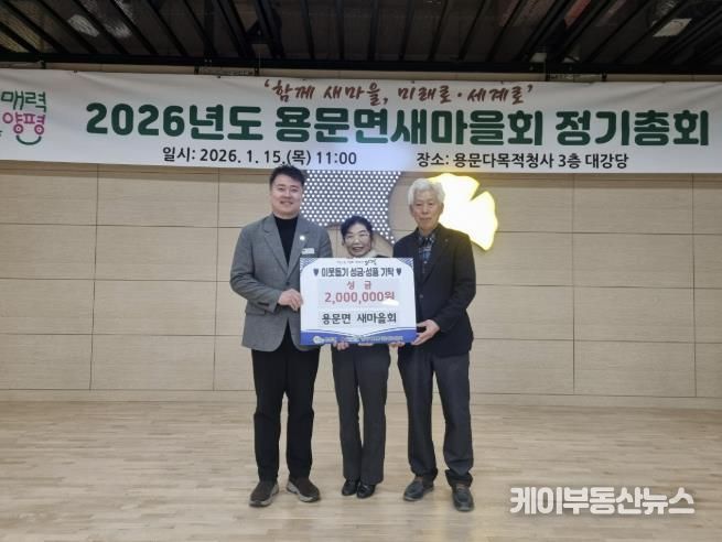케이부동산뉴스 김교민 기자 | 양평군 용문면은 지난 15일 용문면새마을회가 새해를 맞아 지역 내 어려운 이웃을 돕기 위한 성금 200만 원을 기탁하며 따뜻한 나눔을 실천했다고 밝혔다.