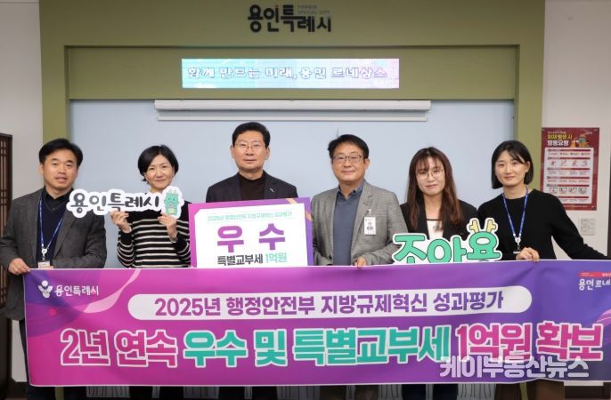 케이부동산뉴스 김교민 기자 | 용인특례시는 지난해에 이어 ‘지방규제혁신 성과평가’에서 우수 기관으로 선정돼 특별교부세 1억 원을 확보했다고 16일 밝혔다.