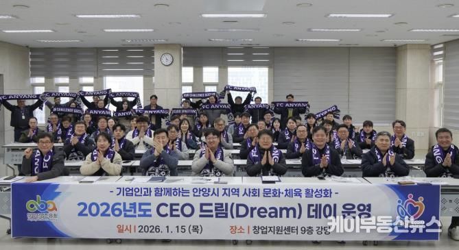 케이부동산뉴스 김교민 기자 | 안양산업진흥원은 15일 오후 3시30분 안양창업지원센터 강당에서 관내 기업인 150여 명을 대상으로 지역사회 문화·체육 활성화를 위한 ‘2026 CEO 드림(Dream) 데이’를 열었다.