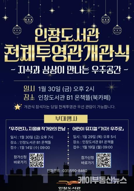 케이부동산뉴스 김교민 기자 | 구리시는 오는 1월 30일 오후 2시 인창도서관 지하 북카페에서 주요 내빈이 참석한 가운데 4층 야외에 조성된 인창도서관 천체투영관 개관식을 개최한다고 밝혔다.