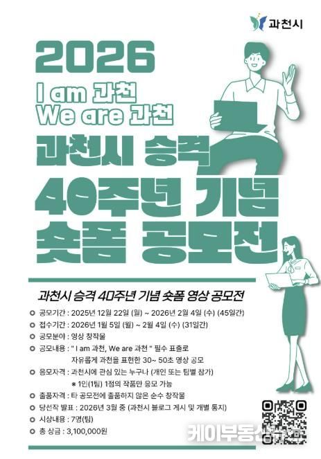 케이부동산뉴스 김교민 기자 | 과천시는 시 승격 40주년을 맞아 ‘숏폼 영상 공모전’을 개최하고, 오는 2월 4일까지 작품을 모집한다고 밝혔다.
