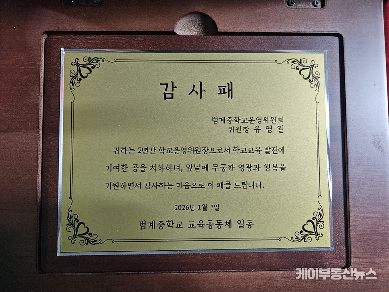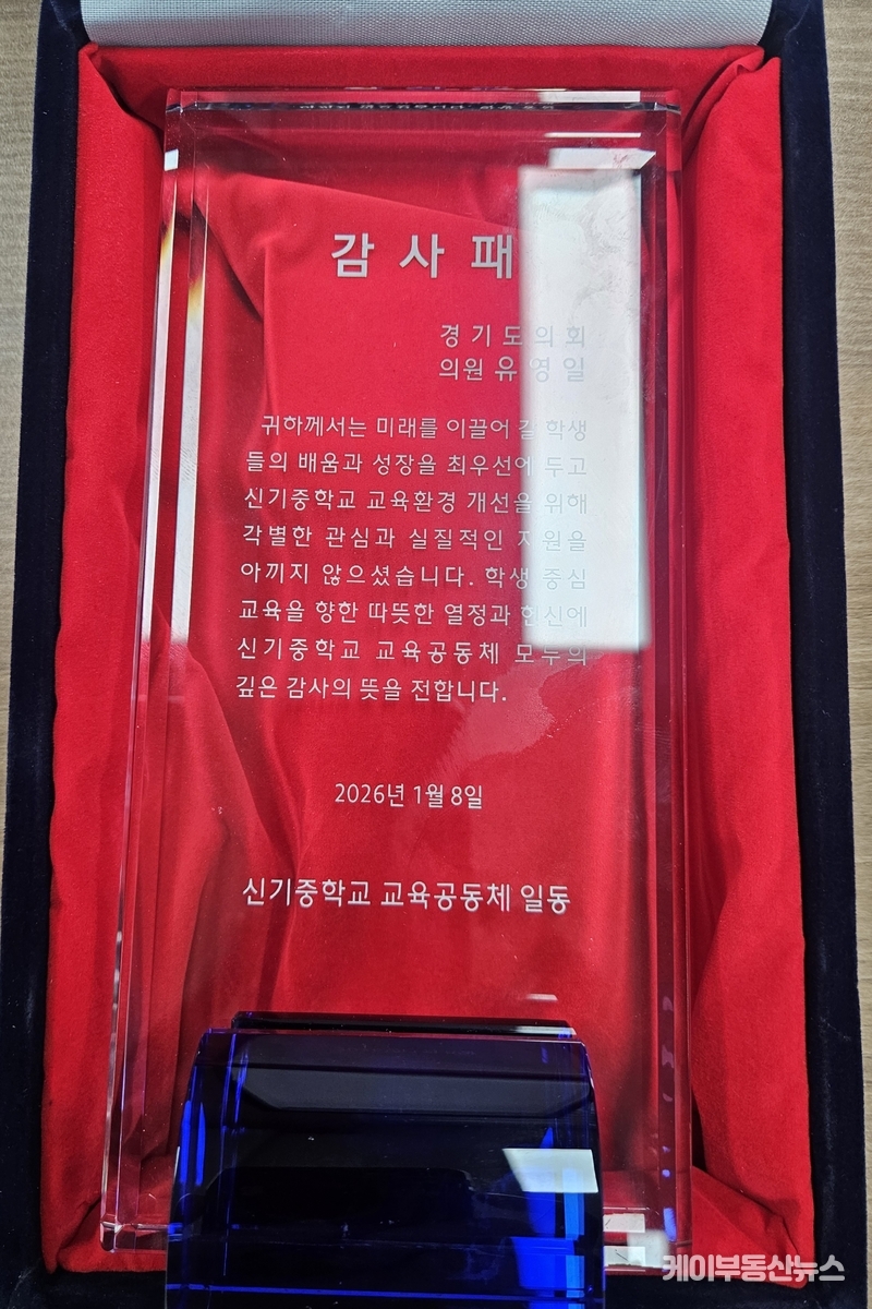 케이부동산뉴스 김교민 기자 | 경기도의회 도시환경위원회 유영일 부위원장(국민의힘, 안양5)이 안양 지역 교육환경 개선과 학교 발전에 기여한 공로를 인정받아 범계중학교와 신기중학교로부터 감사패를 연이어 수상했다.