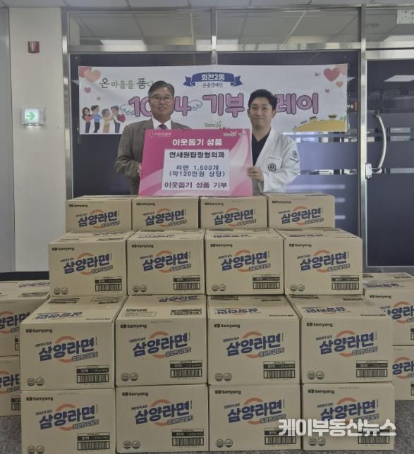 케이부동산뉴스 김교민 기자 | 양주시 회천2동 연세원탑정형외과가 지난 21일 회천2동 행정복지센터에 라면 1,500개(약 120만 원 상당)를 기부했다.