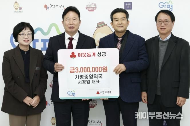 케이부동산뉴스 김교민 기자 | 가평중앙약국 서경원 대표는 21일 이웃돕기 성금 300만원을 가평군에 기탁하며 지역사회 나눔 실천에 동참했다.