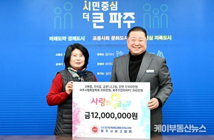케이부동산뉴스 김교민 기자 | 파주시는 22일 파주시광고협회로부터 지역 내 어려운 이웃을 위한 ‘사랑의 이웃 돕기’성금 1,200만 원을 기탁받았다고 밝혔다.