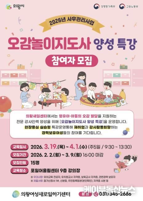 케이부동산뉴스 김교민 기자 | 의왕시 여성새로일하기센터가 '오감놀이지도사 양성 특강'의 교육생을 모집한다.