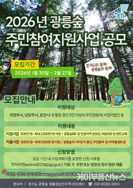 케이부동산뉴스 김교민 기자 | 경기도가 광릉숲 생물권보전지역 활성화를 위해 2026년 광릉숲 주민참여지원사업 참여자를 모집한다.