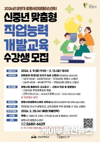 케이부동산뉴스 김교민 기자 | 광명시 인생플러스센터는 신중년의 취업 경쟁력을 높이고 성공적인 인생 재도약을 지원하기 위해 오는 13일까지 ‘2026년 상반기 신중년 맞춤형 직업능력개발교육과정’ 수강생을 모집한다.