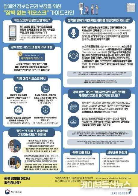 최근 개정된 ‘장애인차별금지 및 권리구제 등에 관한 법률’ 시행령에 따라, 공공과 민간에서 키오스크(무인정보단말기)를 설치·운영하는 경우 접근성 검증 기준을 충족하는 기기를 사용하고, 시각장애인을 위한 음성 안내 장치를 갖춰야 한다.