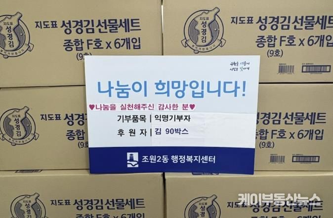케이부동산뉴스 김교민 기자 | 수원시 장안구 조원2동은 지난 3일, 설 명절을 맞아 익명의 기부자가 김 81박스를 기탁해 지역사회에 따뜻한 온정을 전했다고 밝혔다.