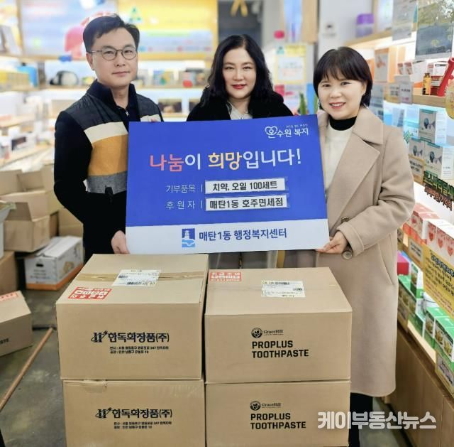 케이부동산뉴스 김교민 기자 | 영통구 매탄1동 행정복지센터는 지난 3일 호주면세점직영할인점 매탄점이 설 명절을 맞이해 매탄1동 행정복지센터에 프로폴리스 치약 100개, 오일 관절크림 100개를 후원했다고 밝혔다.