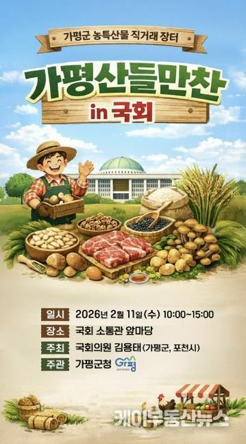 케이부동산뉴스 김교민 기자 | 설 명절을 앞두고 가평군의 우수 농특산물을 한자리에서 만날 수 있는 직거래 장터가 국회에서 열린다. 소비자와 생산자를 직접 연결하는 이번 행사는 도시민들에게 가평 농산물의 우수성과 가평의 관광자원까지 함께 알리는 자리가 될 전망이다.