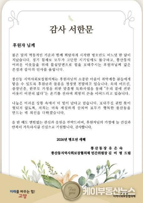 케이부동산뉴스 김교민 기자 | 고양특례시 일산동구 풍산동 지역사회보장협의체는 설명절을 앞둔 지난 3일 지난해 지역사회의 어려운 이웃을 위해 따뜻한 나눔을 실천한 후원자들에게 감사의 마음을 담은 서한문을 발송했다.