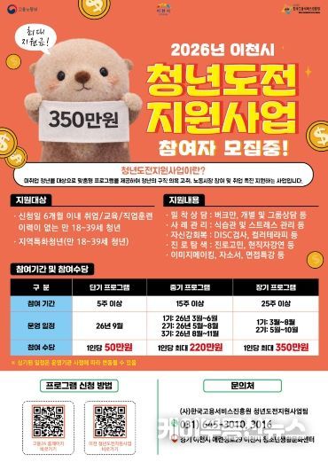 케이부동산뉴스 김교민 기자 | 이천시는 지역 내 미취업 청년들의 진로 탐색과 취업역량 강화를 위해 운영하는 ‘청년도전지원사업’의 참여자를 2월 4일부터 모집한다고 밝혔다.