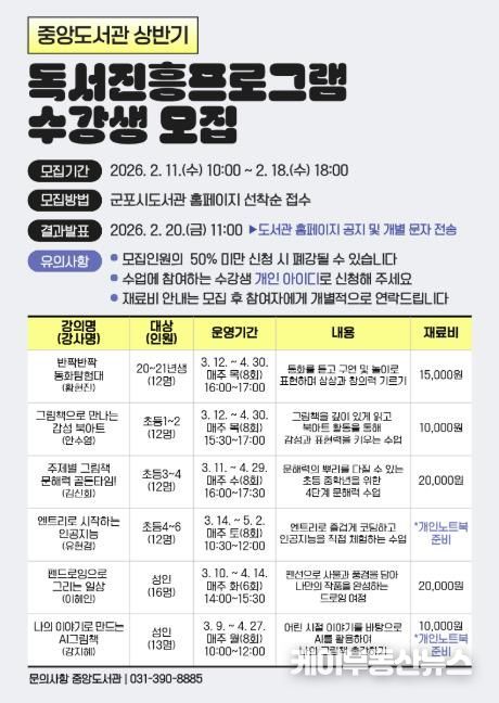 케이부동산뉴스 김교민 기자 | 군포시 중앙도서관은 다가오는 3월 시민들의 독서역량 개발과 지속적인 독서활동을 고취하기 위해 상반기 독서진흥프로그램을 운영한다.