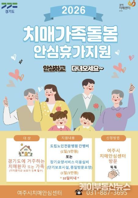 케이부동산뉴스 김교민 기자 | 여주시치매안심센터는 2026년에도 치매환자를 돌보는 가족이 잠시나마 돌봄에서 벗어나 휴식을 취할 수 있도록『치매가족돌봄 안심휴가제』를 지속적으로 운영한다.