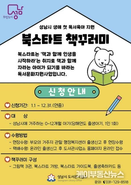케이부동산뉴스 김교민 기자 | 성남시는 올해 출생아 가정을 대상으로 ‘북스타트(Book Start) 책 꾸러미 지원사업’을 시행한다고 6일 밝혔다.