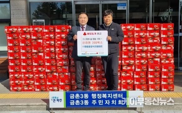 케이부동산뉴스 김교민 기자 | 파주시 금촌3동은 ㈜화림중앙식자재마트 파주금촌역점으로부터 병오년 설 명절을 맞아 지난 3일, 라면(20개입) 200상자를 관내 취약계층과 노인 가구를 위해 기탁하며 따뜻한 나눔을 실천했다.