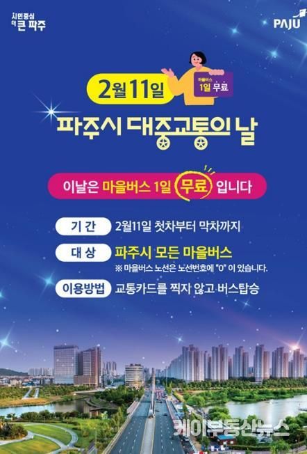 케이부동산뉴스 김교민 기자 | 파주시는 ‘대중교통의 날’을 맞아 대중교통 이용 활성화와 시민 교통비 부담 완화를 위해 오는 2월 11일 하루 동안 파주시 전 지역의 모든 마을버스를 무료로 운행한다.