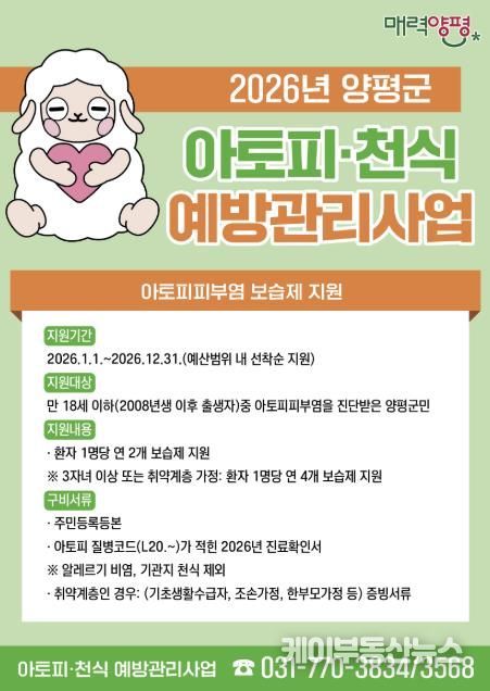 케이부동산뉴스 김교민 기자 | 양평군은 지역사회 중심의 알레르기질환 조기 발견과 적절한 치료를 위해 양평군민을 대상으로 2026년 연중 ‘아토피피부염 보습제 지원’과 ‘취약계층 알레르기질환 의료비 지원’ 사업을 추진한다고 밝혔다.