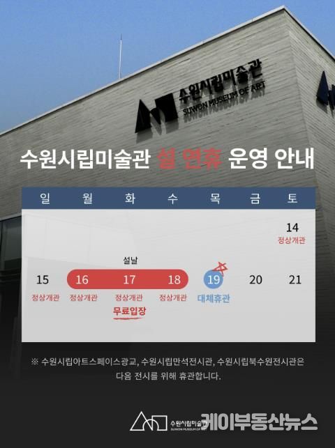 수원시립미술관 행궁 본관은 설 연휴 기간인 2월 15일부터 18일까지 정상 개방하며 설 당일인 2월 17일에는 무료 관람을 실시하며, 2월 19일에 대체 휴관한다.
