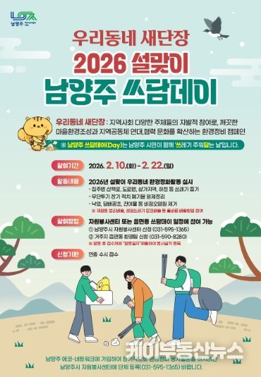 케이부동산뉴스 김교민 기자 | 남양주시는 10일부터 22일까지 시 전역에서 ‘설맞이 우리동네 새단장 남양주 쓰담데이 집중 추진기간’을 운영한다고 밝혔다.
