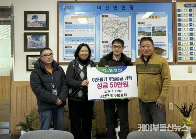 케이부동산뉴스 김교민 기자 | 미산면 탁구동호회는 지난 9일 미산면 지역사회보장협의체에 이웃돕기 성금 50만원을 기탁했다.
