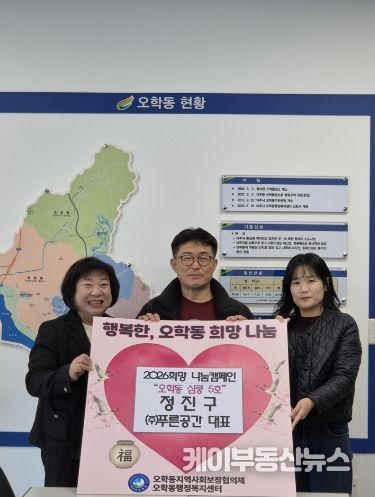 케이부동산뉴스 김교민 기자 | 여주시 오학동은 ㈜푸른공간 정진구 대표가 지난 10일 오학동 행정복지센터를 방문해 이웃돕기 성금 50만 원을 기탁했다고 밝혔다.