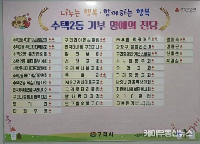 케이부동산뉴스 김교민 기자 | 구리시 수택2동 행정복지센터는 수택2동 행정복지센터 2층에 ‘수택2동 기부 명예의 전당’을 설치하고, 지역사회 나눔 문화 확산을 위한 뜻깊은 공간을 마련했다고 밝혔다.
