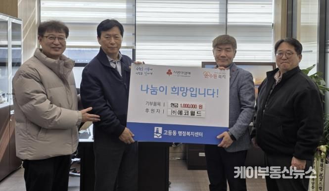 케이부동산뉴스 김교민 기자 | 수원시 팔달구 고등동은 지난 11일, ㈜에코월드에서 고등동 관내 지역주민을 위해 성금 100만원을 기탁했다고 밝혔다.