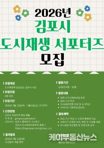케이부동산뉴스 김교민 기자 | 김포시는 다양한 도시재생사업을 홍보하고 도시재생에 대한 시민들의 이해와 관심을 도모하고자 오는 12일부터 ‘2026년 김포시 도시재생 서포터즈’를 모집한다.