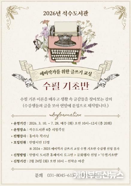 케이부동산뉴스 김교민 기자 | 안양시 석수도서관은 문학과 글쓰기에 관심 있는 안양 시민을 대상으로 ‘예비작가를 위한 글쓰기 교실’ 수필 기초반 및 소설 창작반을 운영한다고 13일 밝혔다.