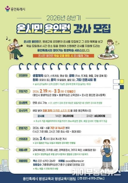 시 관계자는 “시민들의 일상 속으로 배움을 직접 배달하는 ‘온시민 용인런’을 연 2회 정기 운영하게 됐다”며 “상반기 교육 현장에서 시민들의 학습 욕구를 채워줄 열정적인 강사분들의 많은 참여를 바란다”고 했다.