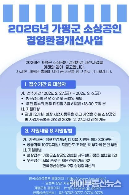 케이부동산뉴스 김교민 기자 | 가평군은 관내 소상공인의 지속경영 기반을 강화하기 위해 ‘2026년 가평군 소상공인 경영환경개선사업’ 대상자를 3월 6일까지 모집한다고 밝혔다.